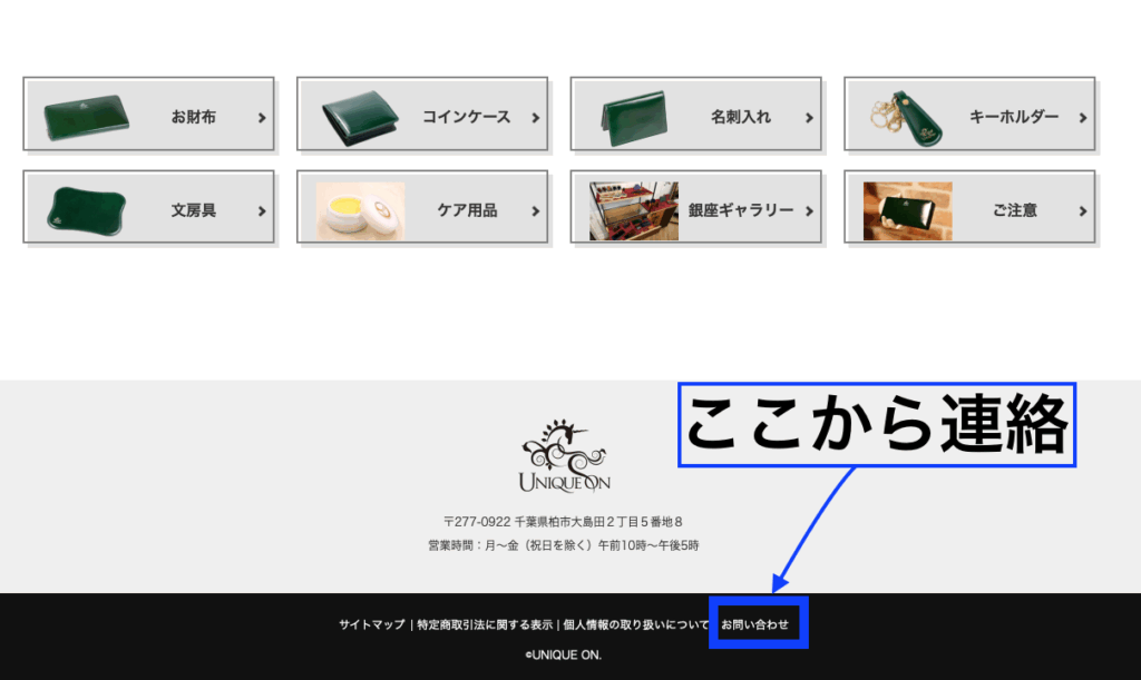 修理依頼は公式サイトの1ページ目の一番下にある「お問い合わせ」から連絡することができます。