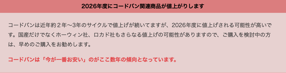 コードバンは「今が一番リーズナブル」です。あらゆる要素を見ても価格が下がることはほぼありません